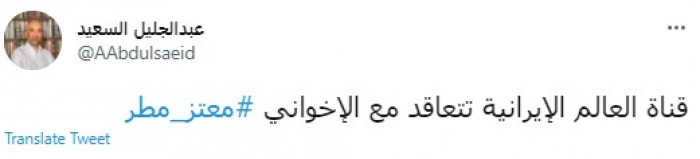 وقال في تغريدة عبر "تويتر" رصدها "المشهد العربي": "قناة العالم الإيرانية تتعاقد مع الإخواني معتز مطر".