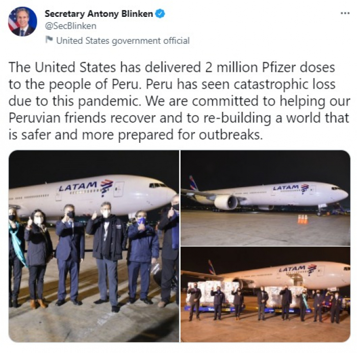 وقال في تغريدة عبر "تويتر" رصدها "المشهد العربي": "قدمت الولايات المتحدة 2 مليون جرعة من شركة فايزر لشعب بيرو".