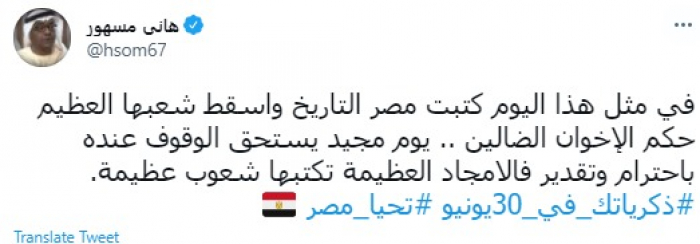 وقال في تغريدة عبر "تويتر" رصدها "المشهد العربي": "في مثل هذا اليوم كتبت مصر التاريخ وأسقط شعبها العظيم حكم الإخوان الضالين .. يوم مجيد يستحق الوقوف عنده باحترام وتقدير فالامجاد العظيمة تكتبها شعوب عظيمة".