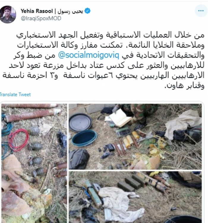وقال في تغريدة عبر "تويتر" رصدها "المشهد العربي": "من خلال العمليات الاستباقية وتفعيل الجهد الاستخباري وملاحقة الخلايا النائمة، تمكنت مفارز وكالة الاستخبارات والتحقيقات الاتحادية في وزارة الداخلية العراقية من ضبط وكر للإرهابيين".