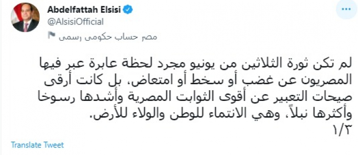 وقال في سلسلة تغريدات عبر "تويتر" رصدها "المشهد العربي": "لم تكن ثورة الثلاثين من يونيو مجرد لحظة عابرة عبر فيها المصريون عن غضب أو سخط أو امتعاض، بل كانت أرقى صيحات التعبير عن أقوى الثوابت المصرية وأشدها رسوخا وأكثرها نبلاً، وهي الانتماء للوطن والولاء للأرض".