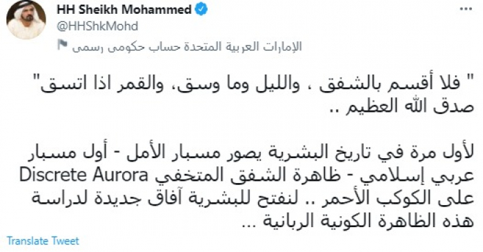 قال نائب رئيس الإمارات رئيس مجلس الوزراء حاكم دبي، الشيخ محمد بن راشد آل مكتوم، إنه لأول مرة في تاريخ البشرية يصور مسبار الأمل - أول مسبار عربي إسلامي - ظاهرة الشفق المتخفي.
