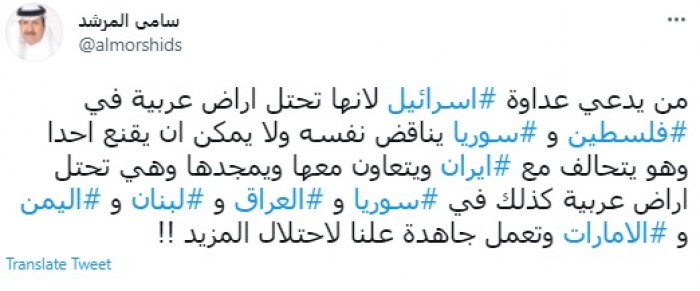 وقال في تغريدة عبر "تويتر" رصدها "المشهد العربي": "من يدعي عداوة إسرائيل لأنها تحتل أراض عربية في فلسطين وسوريا يناقض نفسه ولا يمكن أن يقنع أحدا وهو يتحالف مع إيران ويتعاون معها ويمجدها وهي تحتل أراض عربية".