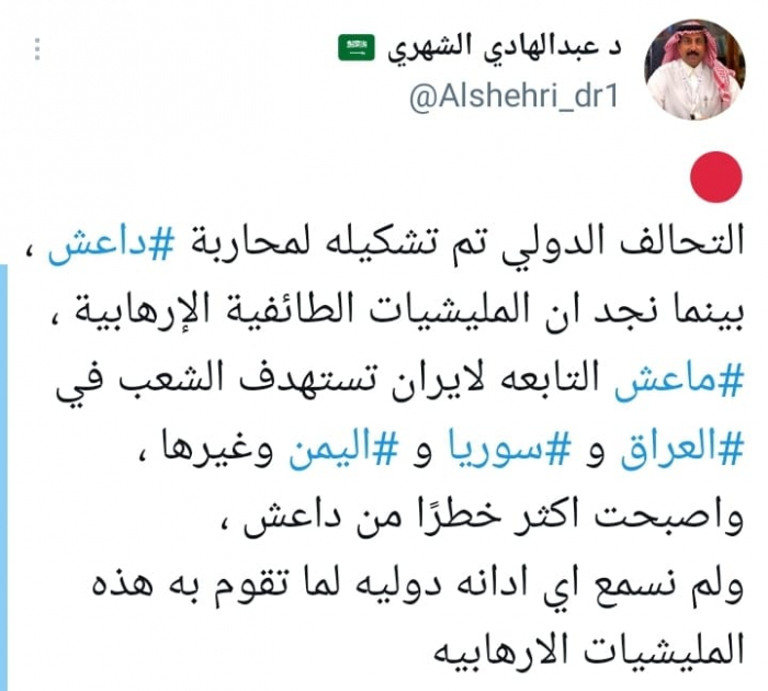 عبدالهادي الشهري: مليشيات إيران أخطر من داعش