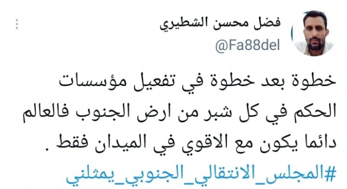 وقال في تغريدة على حسابه بموقع التدوين المصغر تويتر، اليوم إنه: "خطوة بعد خطوة في تفعيل مؤسسات الحكم في كل شبر من أرض الجنوب".