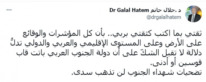 وشدد في تغريدة على تويتر، اليوم الخميس على أن: "ثقتي بما اكتب كثقتي بربي.. بأن كل المؤشرات والوقائع على الأرض وعلى المستوى الإقليمي والعربي والدولي تدلُّ دلالة لا تقبل الشكّ على أن دولة الجنوب العربي باتت قاب قوسين أو أدنى"، مضيفا أن: "تضحيات شهداء الجنوب لن تذهب سدى".