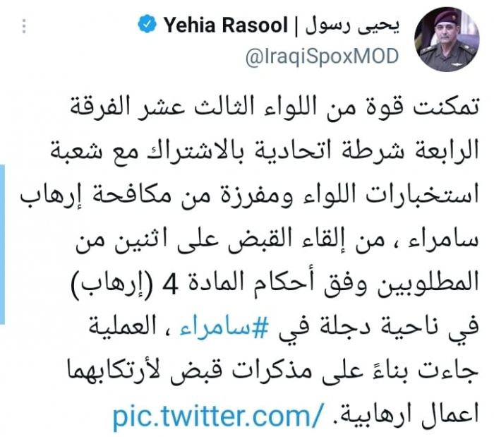 وشدد في تغريدة على حسابه بموقع التدوين المصغر تويتر، اليوم على أنه: "تمكنت قوة من اللواء الثالث عشر الفرقة الرابعة شرطة اتحادية بالاشتراك مع شعبة استخبارات اللواء ومفرزة من مكافحة إرهاب سامراء، من إلقاء القبض على اثنين من المطلوبين وفق أحكام المادة 4 (إرهاب) في ناحية دجلة في سامراء"، مضيفا أن: "العملية جاءت بناءً على مذكرات قبض لارتكابهما أعمال إرهابية".