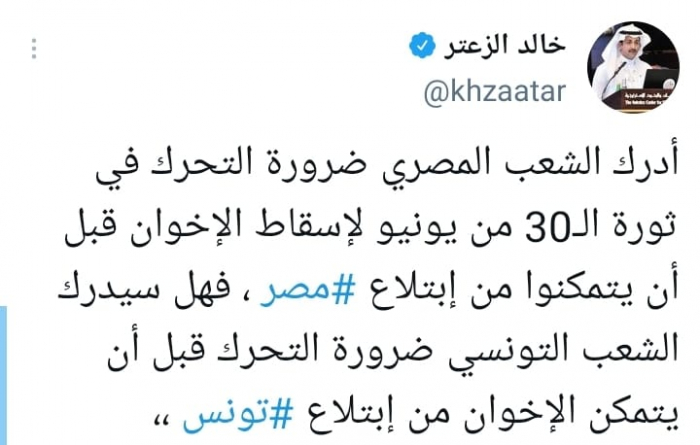 وأكد في تغريدة على حسابه بموقع التدوين المصغر تويتر، اليوم أنه: "أدرك الشعب المصري ضرورة التحرك في ثورة الـ30 من يونيو لإسقاط الإخوان قبل أن يتمكنوا من إبتلاع مصر".