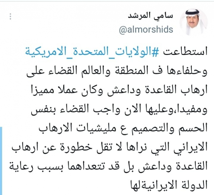 وأوضح أن: "عليها الآن واجب القضاء بنفس الحسم والتصميم على مليشيات الإرهاب الإيراني التي نراها لا تقل خطورة عن إرهاب القاعدة وداعش بل قد تتعداهما بسبب رعاية الدولة الإيرانية لها".