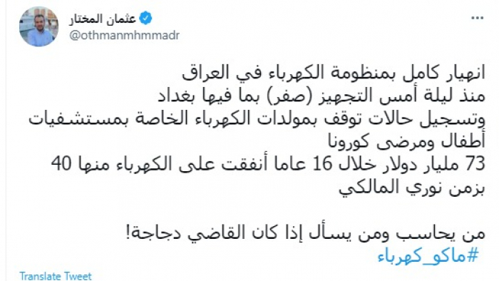وقال في تغريدة عبر "تويتر" رصدها "المشهد العربي": "انهيار كامل بمنظومة الكهرباء في العراق منذ ليلة أمس التجهيز (صفر) بما فيها بغداد وتسجيل حالات توقف بمولدات الكهرباء الخاصة بمستشفيات أطفال ومرضى كورونا".