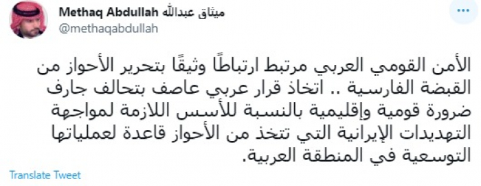 وقال في تغريدة عبر "تويتر" رصدها "المشهد العربي": "الأمن القومي العربي مرتبط ارتباطًا وثيقًا بتحرير الأحواز من القبضة الفارسية".
