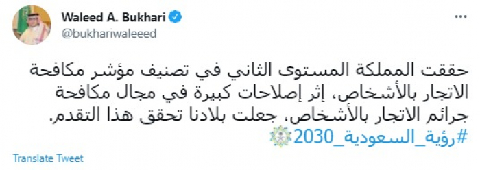 وكتب في تغريدة عبر "تويتر" رصدها "المشهد العربي": "حققت المملكة المستوى الثاني في تصنيف مؤشر مكافحة الاتجار بالأشخاص، إثر إصلاحات كبيرة في مجال مكافحة جرائم الاتجار بالأشخاص، جعلت بلادنا تحقق هذا التقدم".