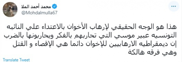 وقال في تغريدة عبر "تويتر" رصدها "المشهد العربي": "هذا هو الوجه الحقيقي لإرهاب الأخوان بالاعتداء علي النائبه التونسيه عبير موسي التي تحاربهم بالفكر ويحاربونها بالضرب".