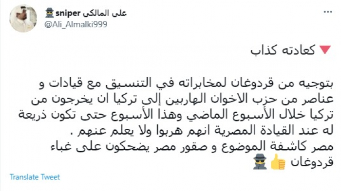 وقال في تغريدة عبر "تويتر" رصدها "المشهد العربي": "كعادته كذاب.. بتوجيه من قردوغان لمخابراته في التنسيق مع قيادات وعناصر من حزب الإخوان الهاربين إلى تركيا أن يخرجوا من تركيا خلال الأسبوع الماضي وهذا الأسبوع حتى تكون ذريعة له عند القيادة المصرية أنهم هربوا ولا يعلم عنهم".