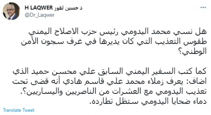 وقال في تغريدة عبر "تويتر" رصدها "المشهد العربي": "هل نسي محمد اليدومي رئيس حزب الإصلاح اليمني طقوس التعذيب التي كان يديرها في غرف سجون الأمن الوطني؟".