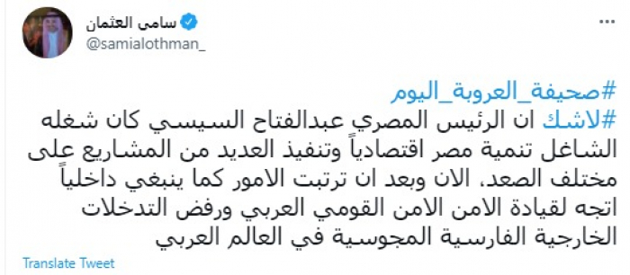 العثمان: السيسي يقود حاليًا مكافحة أطماع إيران بالمنطقة