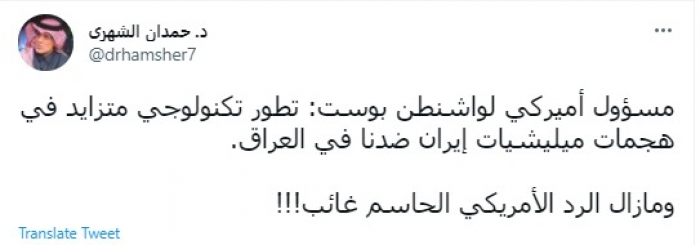 وكتب في تغريدة عبر "تويتر" رصدها "المشهد العربي": "مسؤول أميركي لواشنطن بوست: تطور تكنولوجي متزايد في هجمات مليشيات إيران ضدنا في العراق. وما زال الرد الأمريكي الحاسم غائب".