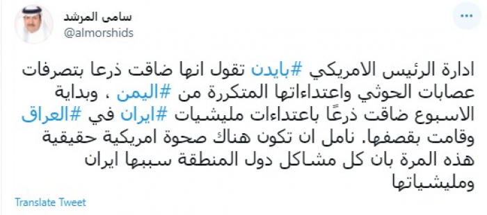 وكتب في تغريدة عبر "تويتر" رصدها "المشهد العربي": "إدارة الرئيس الأمريكي بايدن تقول إنها ضاقت ذرعا بتصرفات عصابات الحوثي واعتداءاتها المتكررة من اليمن".