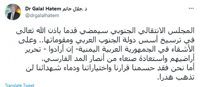 وكتب في تغريدة عبر "تويتر" رصدها "المشهد العربي": "المجلس الانتقالي الجنوبي سيمضي قدمًا باذن الله تعالى في ترسيخ أسس دولة الجنوب العربي ومقوماتها".