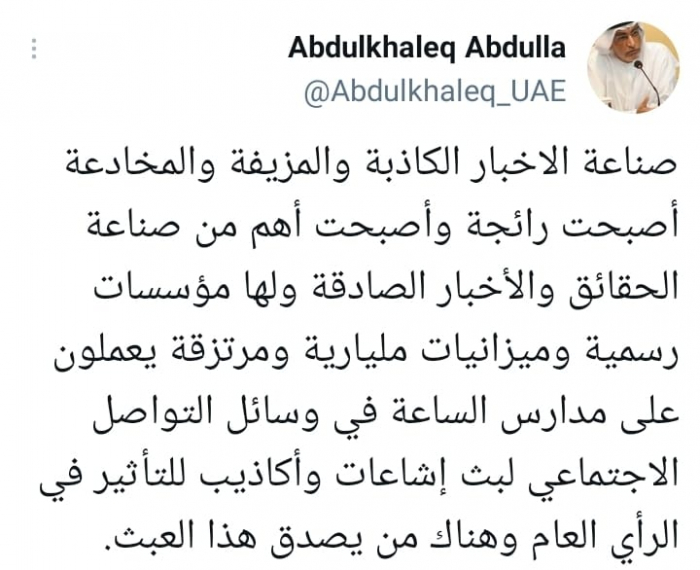 كشف الأكاديمي الإماراتي، الدكتور عبدالخالق عبدالله، عن صناعة لترويج الأخبار المزيفة تتجاوز ميزانياتها المليارات، لترويج أحداث مزيفة.