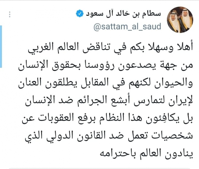 تعجب الأمير السعودي سطام بن خالد آل سعود، من تناقض الغرب في التعامل مع إيران والسماح بارتكابها الجرائم البشعة، بينما يرفع شعارات الدفاع عن حقوق الإنسان.