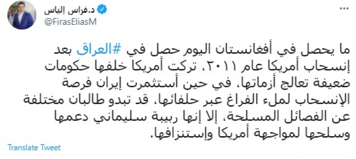 وكتب في تغريدة عبر "تويتر" رصدها "المشهد العربي": "ما يحصل في أفغانستان اليوم حصل في العراق بعد إنسحاب أمريكا عام ٢٠١١، تركت أمريكا خلفها حكومات ضعيفة تعالج أزماتها".