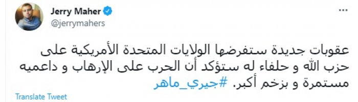 توقع الكاتب الصحفي اللبناني جيري ماهر، اليوم السبت، فرض أمريكا لعقوبات جديدة على حزب الله اللبناني.