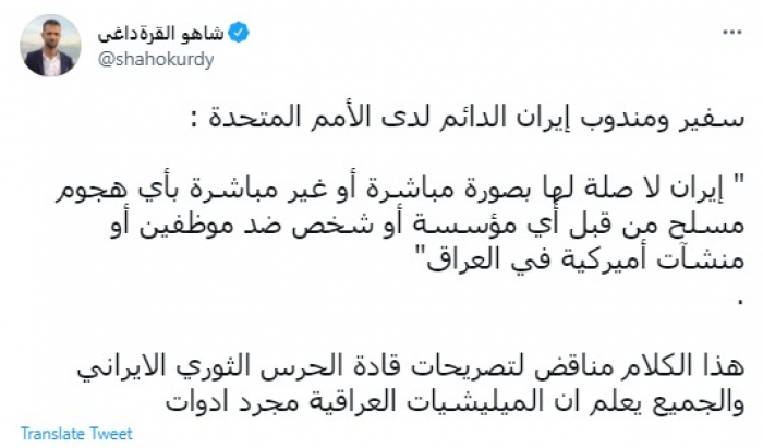 وقال في تغريدة عبر "تويتر" رصدها "المشهد العربي": "سفير ومندوب إيران الدائم لدى الأمم المتحدة: إيران لا صلة لها بصورة مباشرة أو غير مباشرة بأي هجوم مسلح من قبل أي مؤسسة أو شخص ضد موظفين أو منشآت أميركية في العراق".