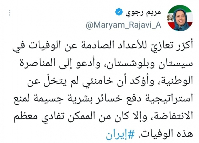 وأوضحت في تغريدة على حسابها بموقع التدوين المصغر تويتر، اليوم إني: "أكرّر تعازيّ للأعداد الصادمة عن الوفيات في سيستان وبلوشستان، وأدعو إلى المناصرة الوطنية".