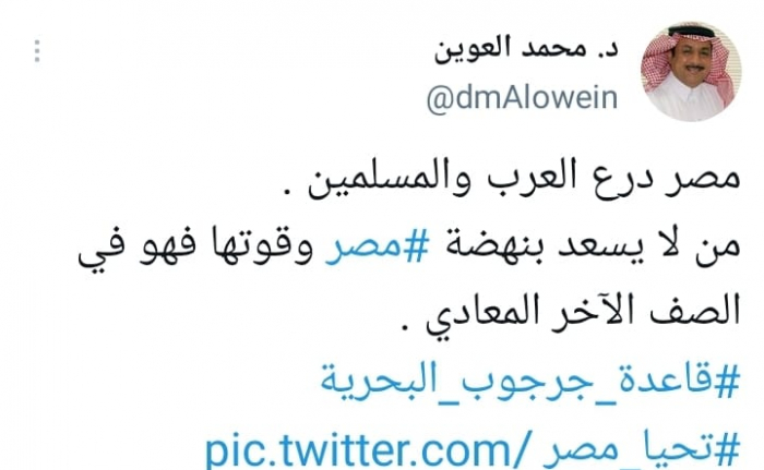 وأشار في تغريدة على حسابه بموقع التدوين المصغر تويتر، اليوم إلى أن: "مصر درع العرب والمسلمين".