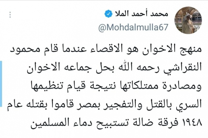 وأشار في تغريدة على حسابه بموقع التدوين المصغر تويتر، اليوم إلى أن: "منهج الإخوان هو الإقصاء، عندما قام محمود النقراشي رحمه الله بحل جماعه الإخوان ومصادرة ممتلكاتها نتيجة قيام تنظيمها السري بالقتل والتفجير بمصر قاموا بقتله عام 1948"، مؤكدا أنها: "فرقة ضالة تستبيح دماء المسلمين".