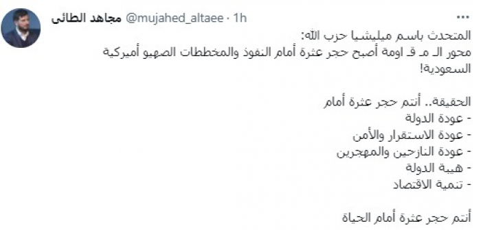 وقال في تغريدة عبر "تويتر" رصدها "المشهد العربي": "المتحدث باسم مليشيا حزب الله: محور المقاومة أصبح حجر عثرة أمام النفوذ والمخططات الصهيو أميركية".