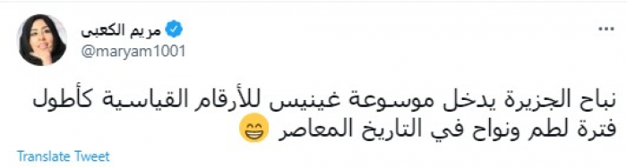 وقالت في تغريدة عبر "تويتر" رصدها "المشهد العربي": "نباح الجزيرة يدخل موسوعة غينيس للأرقام القياسية كأطول فترة لطم ونواح في التاريخ المعاصر".