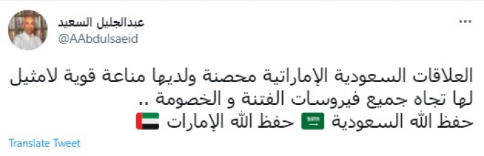 وكتب في تغريدة عبر "تويتر" رصدها "المشهد العربي": "العلاقات السعودية الإماراتية محصنة ولديها مناعة قوية لامثيل لها تجاه جميع فيروسات الفتنة والخصومة ..حفظ الله السعودية حفظ الله الإمارات".
