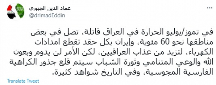 وقال في تغريدة عبر "تويتر" رصدها "المشهد العربي": "في تموز/ يوليو الحرارة في العراق قاتلة، تصل في بعض مناطقها نحو 60 مئوية، وإيران بكل حقد تقطع إمدادات الكهرباء، لتزيد من عذاب العراقيين".