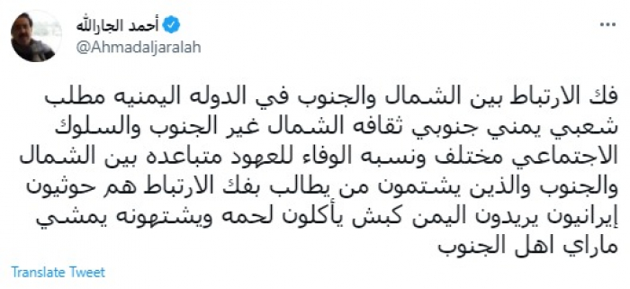 وكتب في تغريدة عبر "تويتر" رصدها "المشهد العربي": "فك الارتباط بين الشمال والجنوب في الدولة اليمنية مطلب شعبي جنوبي".