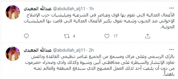 وأضاف في تغريدة أخرى: "بالزّي الرسمي وعلى مرأى ومسمع من الجميع عناصر تنظيمي القاعدة وداعش تعاود الانتشار والسيطرة على محافظتي أبين وشبوة وكذلك وادي وصحراء حضرموت من دون أن يلتفت أحد لذلك العمل الممنهج الذي ستدفع المنطقة والعالم ثمنه باهظًا".
