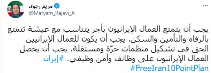 دعت زعيمة المعارضة الإيرانية مريم رجوي، اليوم الأحد، إلى حصول عمال إيران على وظائف وأمن وظيفي وأجور مناسبة.