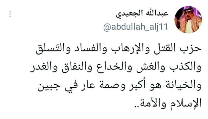وأوضح في تغريدة على حسابه بموقع التدوين المصغر تويتر، اليوم أن: "حزب القتل والإرهاب والفساد والتّسلق والكذب والغش والخداع والنفاق والغدر والخيانة هو أكبر وصمة عار في جبين الإسلام والأمة".