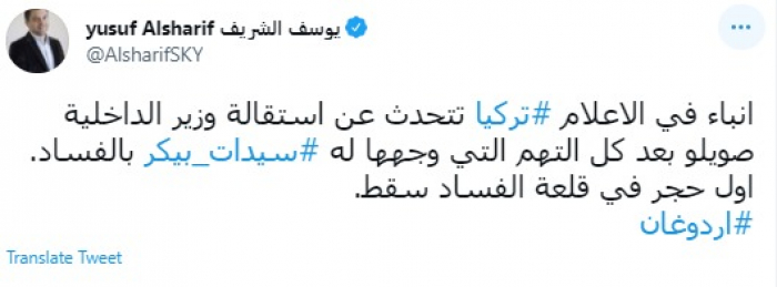 وقال في تغريدة عبر "تويتر" رصدها "المشهد العربي": "أنباء في الإعلام تركيا تتحدث عن استقالة وزير الداخلية صويلو بعد كل التهم التي وجهها له سادات بيكر بالفساد. أول حجر في قلعة الفساد سقط".