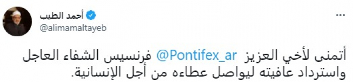 وقال في تغريدة عبر "تويتر" رصدها "المشهد العربي": " أتمنى لأخي العزيز البابا فرنسيس الشفاء العاجل واسترداد عافيته ليواصل عطاءه من أجل الإنسانية".
