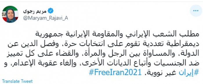 وكتبت في تغريدة عبر "تويتر" رصدها "المشهد العربي": "مطلب الشعب الإيراني والمقاومة الإيرانية جمهورية ديمقراطية تعددية تقوم على انتخابات حرة، وفصل الدين عن الدولة، والمساواة بين الرجل والمرأة، والقضاء على كل تمييز ضد الجنسيات وأتباع الديانات الأخرى، وإلغاء عقوبة الإعدام، وإيران غير نووية".