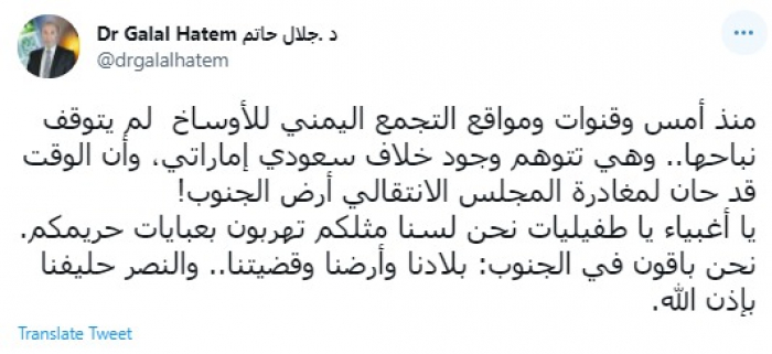 وقال في تغريدة عبر "تويتر" رصدها "المشهد العربي": "منذ أمس وقنوات ومواقع التجمع اليمني للأوساخ لم يتوقف نباحها.. وهي تتوهم وجود خلاف سعودي إماراتي، وأن الوقت قد حان لمغادرة المجلس الانتقالي أرض الجنوب".