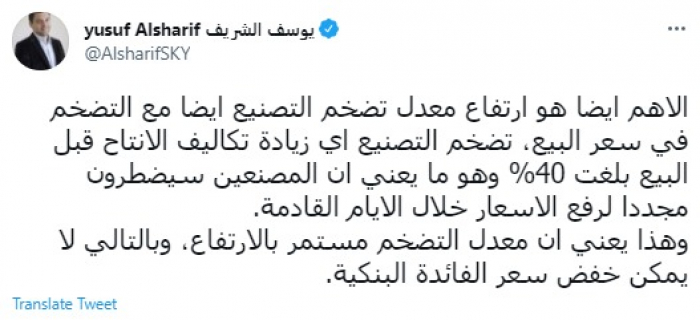 وقال في تغريدة عبر "تويتر" رصدها "المشهد العربي": "الأهم أيضًا هو ارتفاع معدل تضخم التصنيع أيضًا مع التضخم في سعر البيع، تضخم التصنيع أي زيادة تكاليف الإنتاح قبل البيع بلغت 40% وهو ما يعني أن المصنعين سيضطرون مجددا لرفع الأسعار خلال الأيام القادمة".