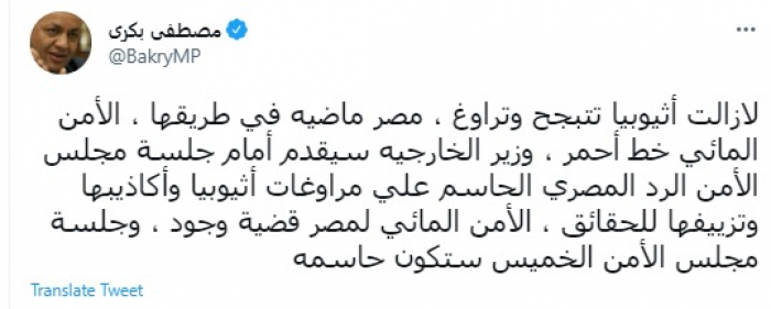 وقال في تغريدة عبر "تويتر" رصدها "المشهد العربي": "لا زالت أثيوبيا تتبجح وتراوغ ، مصر ماضية في طريقها، الأمن المائي خط أحمر".