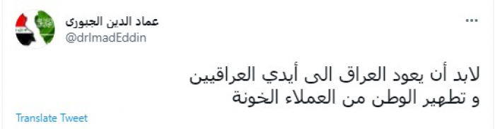 وقال في تغريدة عبر "تويتر" رصدها "المشهد العربي": "لا بد أن يعود العراق إلى أيدي العراقيين وتطهير الوطن من العملاء الخونة".