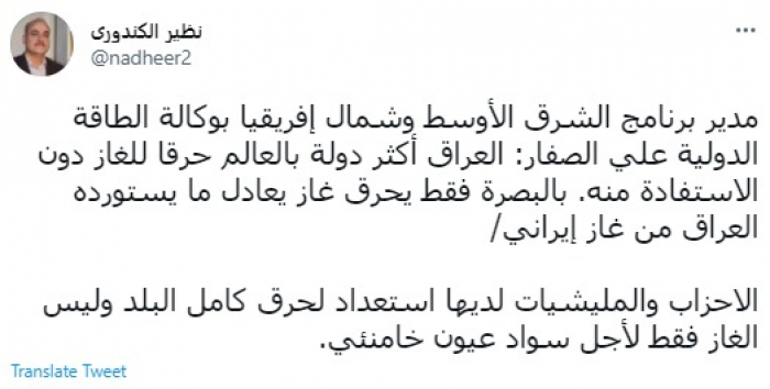 وقال في تغريدة عبر "تويتر" رصدها "المشهد العربي": "مدير برنامج الشرق الأوسط وشمال إفريقيا بوكالة الطاقة الدولية علي الصفار: العراق أكثر دولة بالعالم حرقا للغاز دون الاستفادة منه. بالبصرة فقط يحرق غاز يعادل ما يستورده العراق من غاز إيراني".