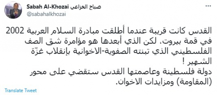 وقال في تغريدة عبر "تويتر" رصدها "المشهد العربي": "القدس كانت قريبة عندما أطلقت مبادرة السلام العربية 2002 في قمة بيروت، لكن الذي أبعدها هو مؤامرة شق الصف الفلسطيني الذي تبنته الصفوية-الإخوانية بإنقلاب غزّة الشهير".