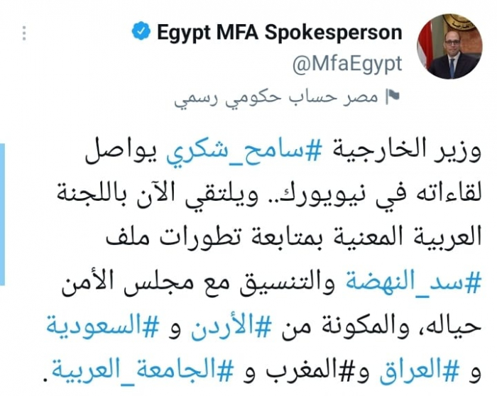 وأضاف أنه: "يلتقي الآن باللجنة العربية المعنية بمتابعة تطورات ملف سد النهضة والتنسيق مع مجلس الأمن حياله، والمكونة من الأردن والسعودية والعراق والمغرب والجامعة العربية".