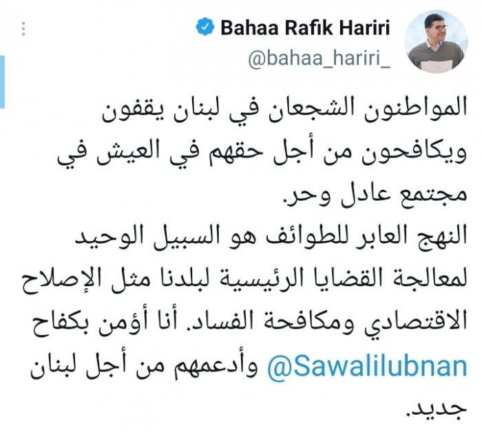 دعا رجل الأعمال بهاء الحريري، نجل رئيس وزراء لبنان الراحل الشهيد رفيق الحريري، إلى تجاوز الطائفية لتحقيق الإصلاح الاقتصادي والقضاء على الفساد في لبنان.